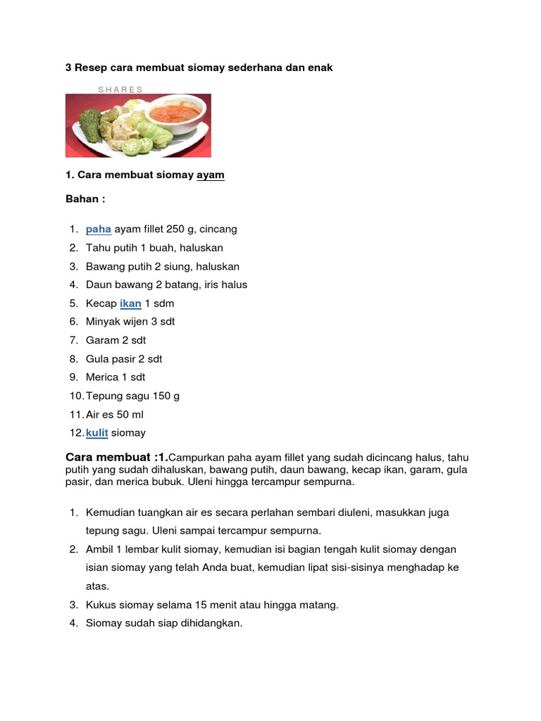 11 resep kue goreng enak, sederhana, dan mudah dibuat; Pasalnya, jenis siomay ini berbeda dari resep awalnya yang konon berasal dari mongolia dalam. Lihat juga resep siomay dimsum ayam udang enak lainnya. Resep siomay sederhana bahan 100 gram tepung terigu 100 gram tepung tapioka 1 sdt garam 1 sdt penyedap rasa 2 lembar sledri 2 lembar daun bawang 100 mili air. Cara dan resep bumbu siomay bandung tida terlalu mewah versi 2